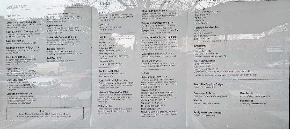 The structure of the menu and its offerings make it suitable for customers seeking breakfast, light lunches, or coffee breaks, with options that range from quick bites to more filling meals.
